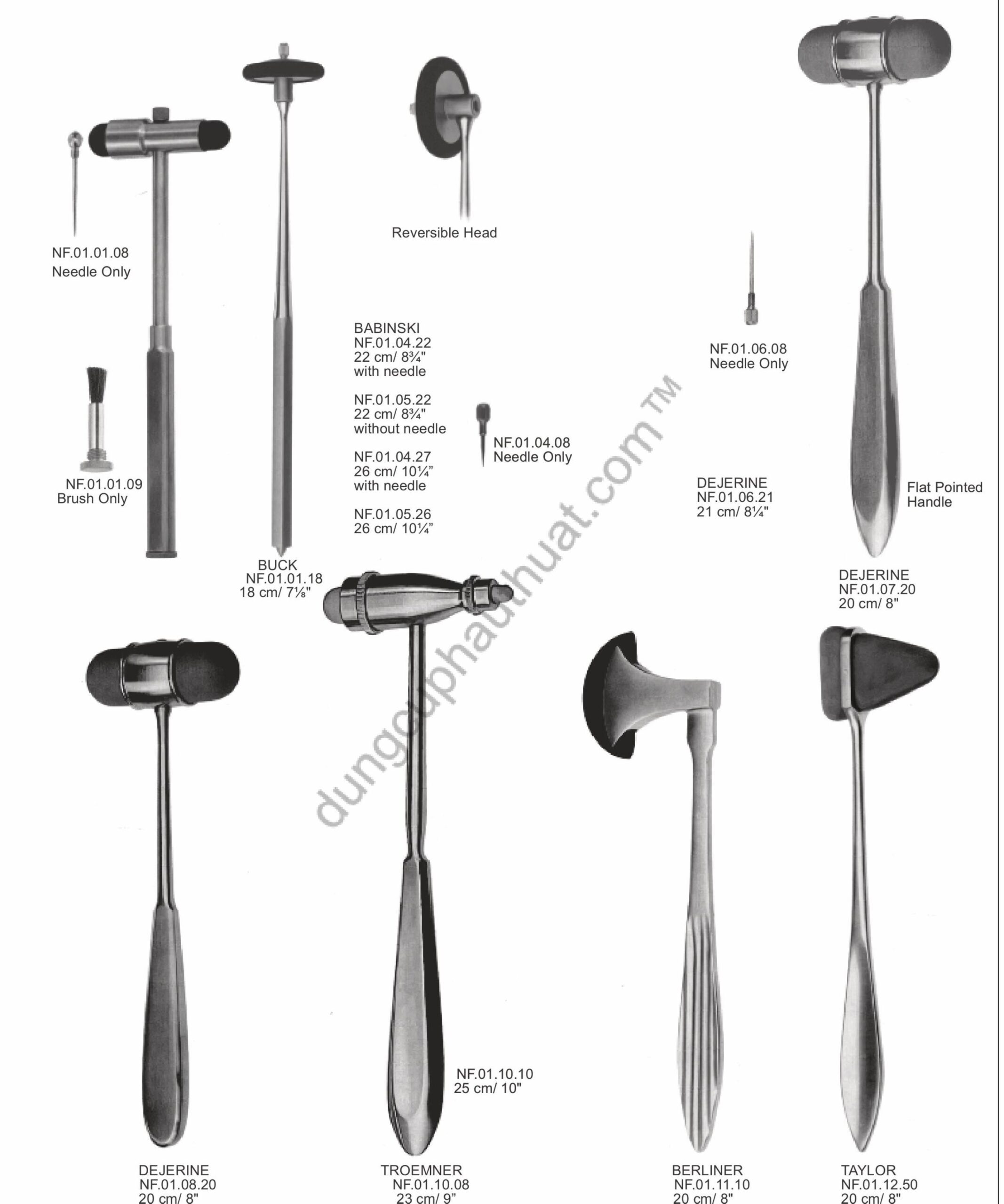 Búa phản xạ (Reflex Hammer) là dụng cụ chính để kiểm tra hệ thần kinh ngoại biên và trung ương thông qua các phản xạ gân xương. Búa có cấu tạo bằng cán thép không gỉ và đầu búa bằng cao su (các hình dạng như tam giá búa Taylor hoặc hình tròn búa Babinski).