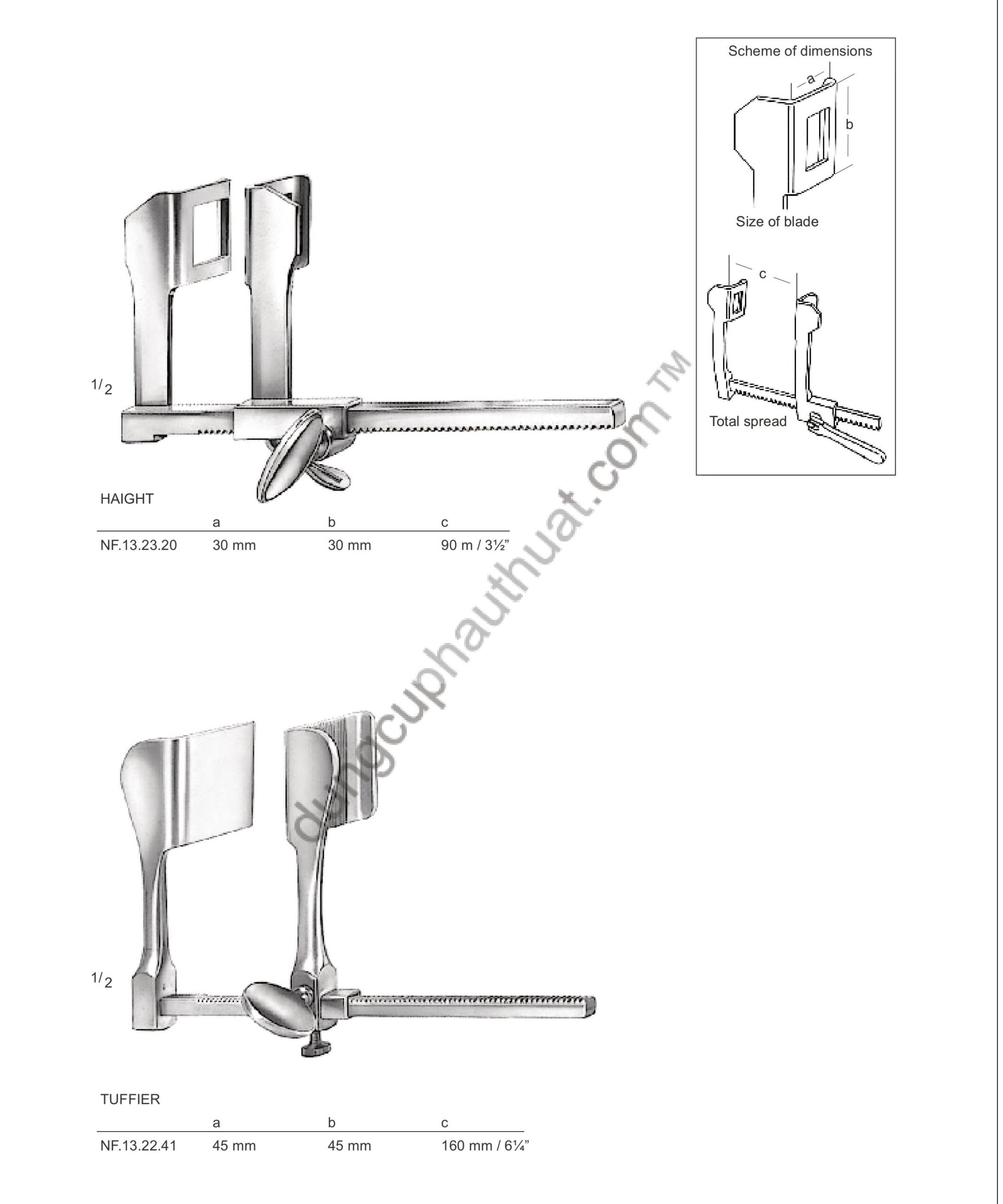 Dụng Cụ Haight: Đặc trưng bởi các thông số kỹ thuật nghiêm ngặt về kích thước lá banh (Size of blade) và tổng độ mở (Total spread).