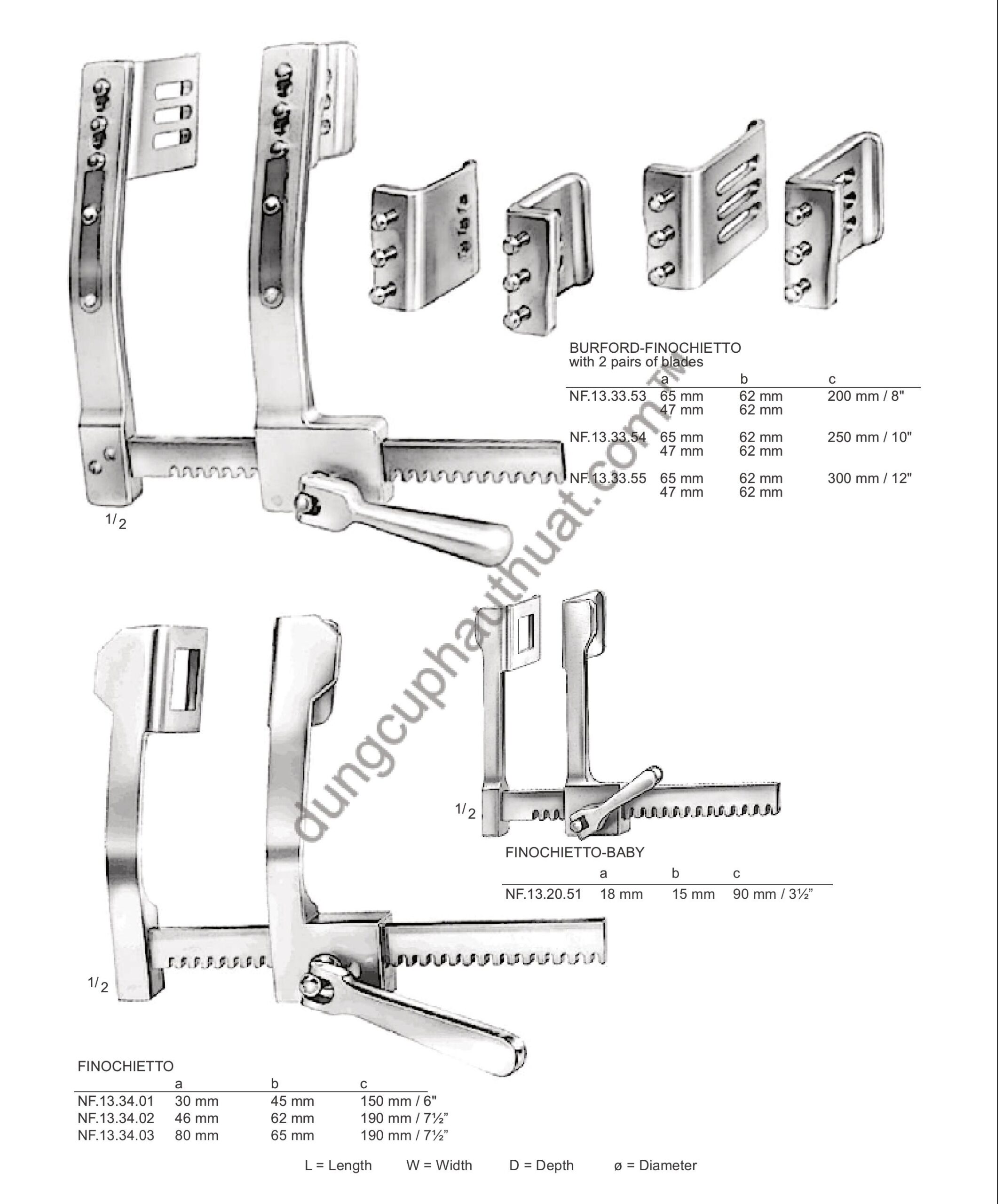 Dụng Cụ Burford – Finochietto: Cải tiến từ Finochietto nhưng đi kèm với 2 cặp lá banh (blades) có thể thay thế (nông và sâu), giúp linh hoạt tùy theo độ dày thành ngực của bệnh nhân.