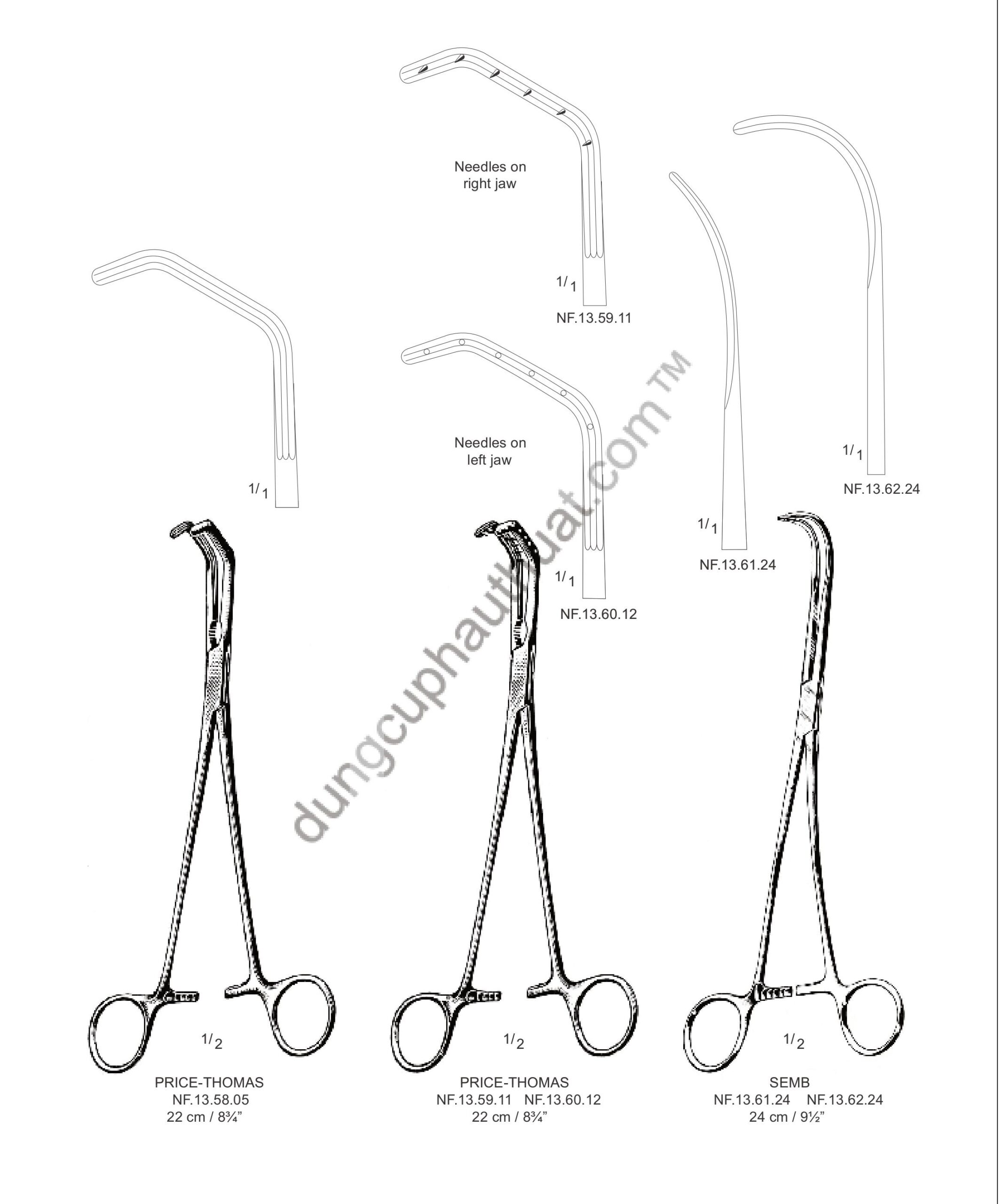 Dụng Cụ Price-Thomas: Kẹp phế quản chuyên dụng có các răng dọc hoặc ngang đặc biệt để kẹp chặt phế quản trước khi khâu/cắt mà không làm trượt mô.