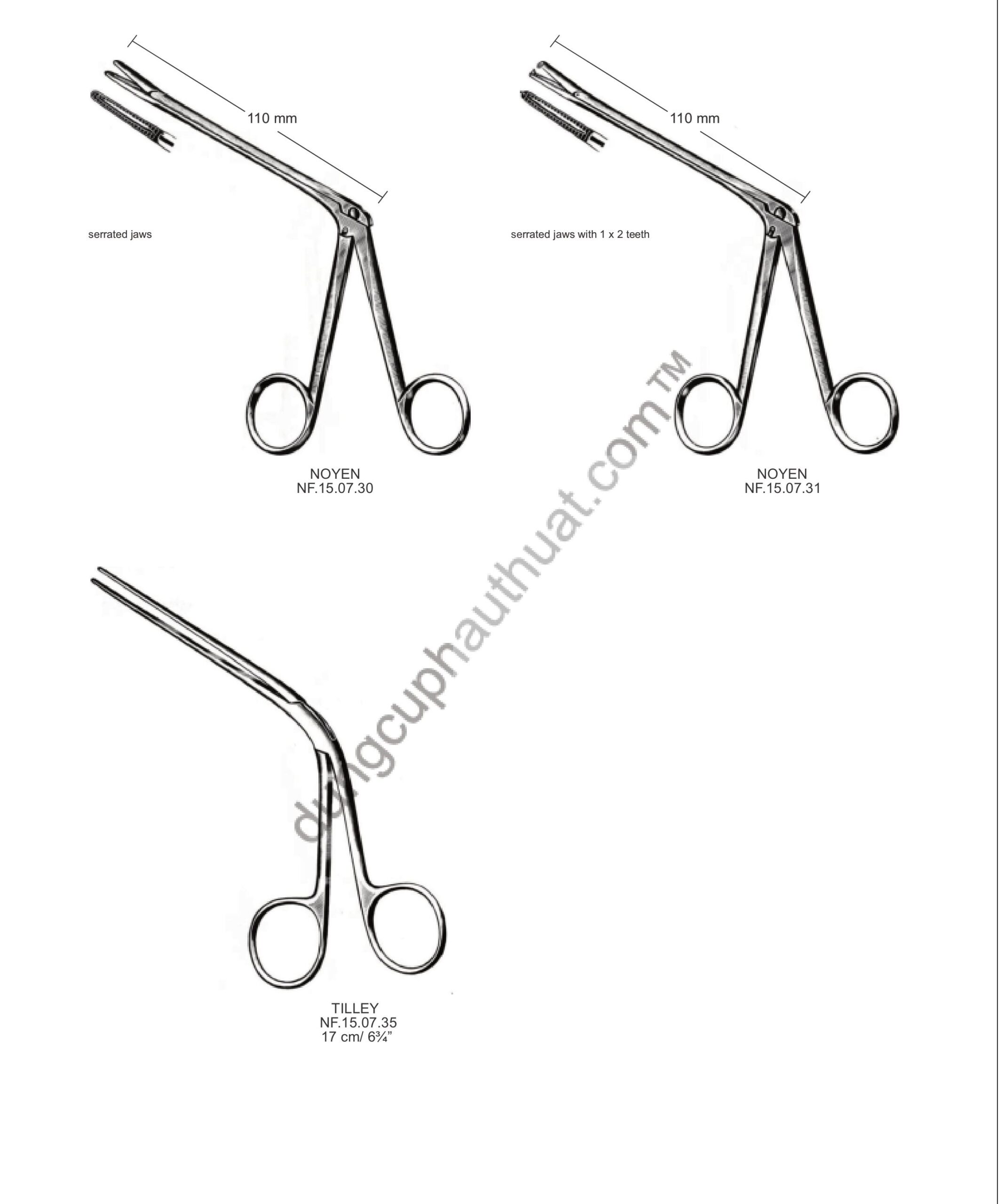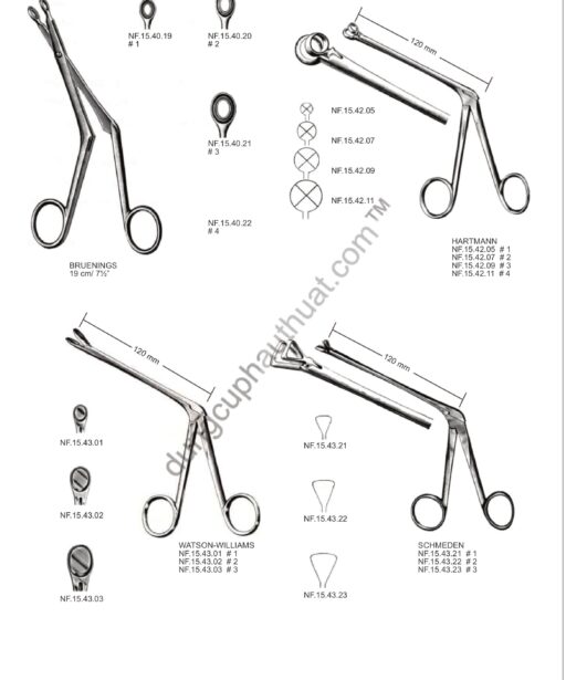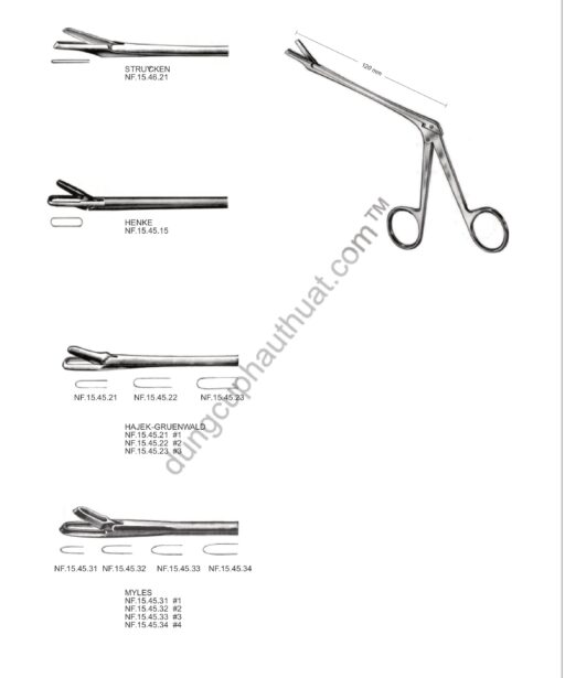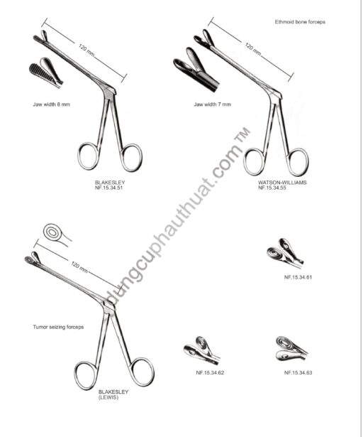 Dụng Cụ Kìm Blakesley: Loại kìm gắp bệnh tích (polyp, niêm mạc viêm) phổ biến nhất với nhiều góc độ (thẳng, cong 45 độ, 90 độ) để có thể len lỏi vào các ngách xoang hàm, xoang sàng.