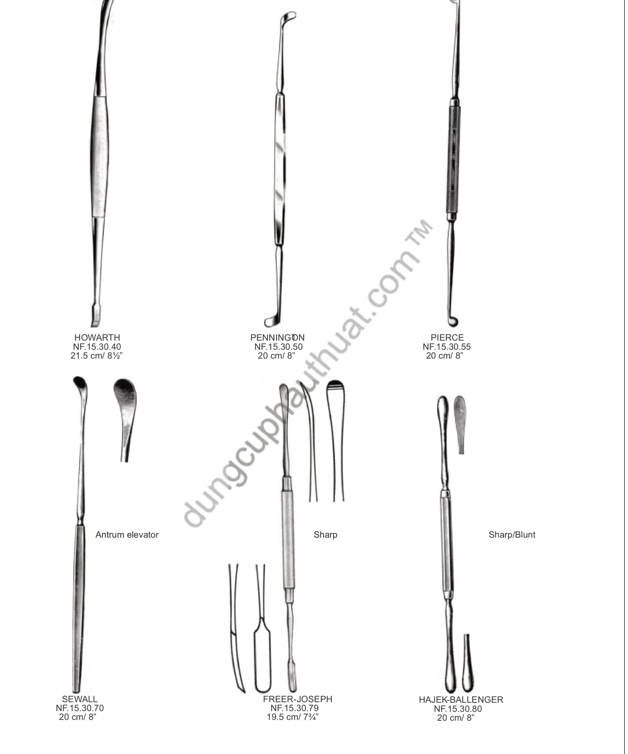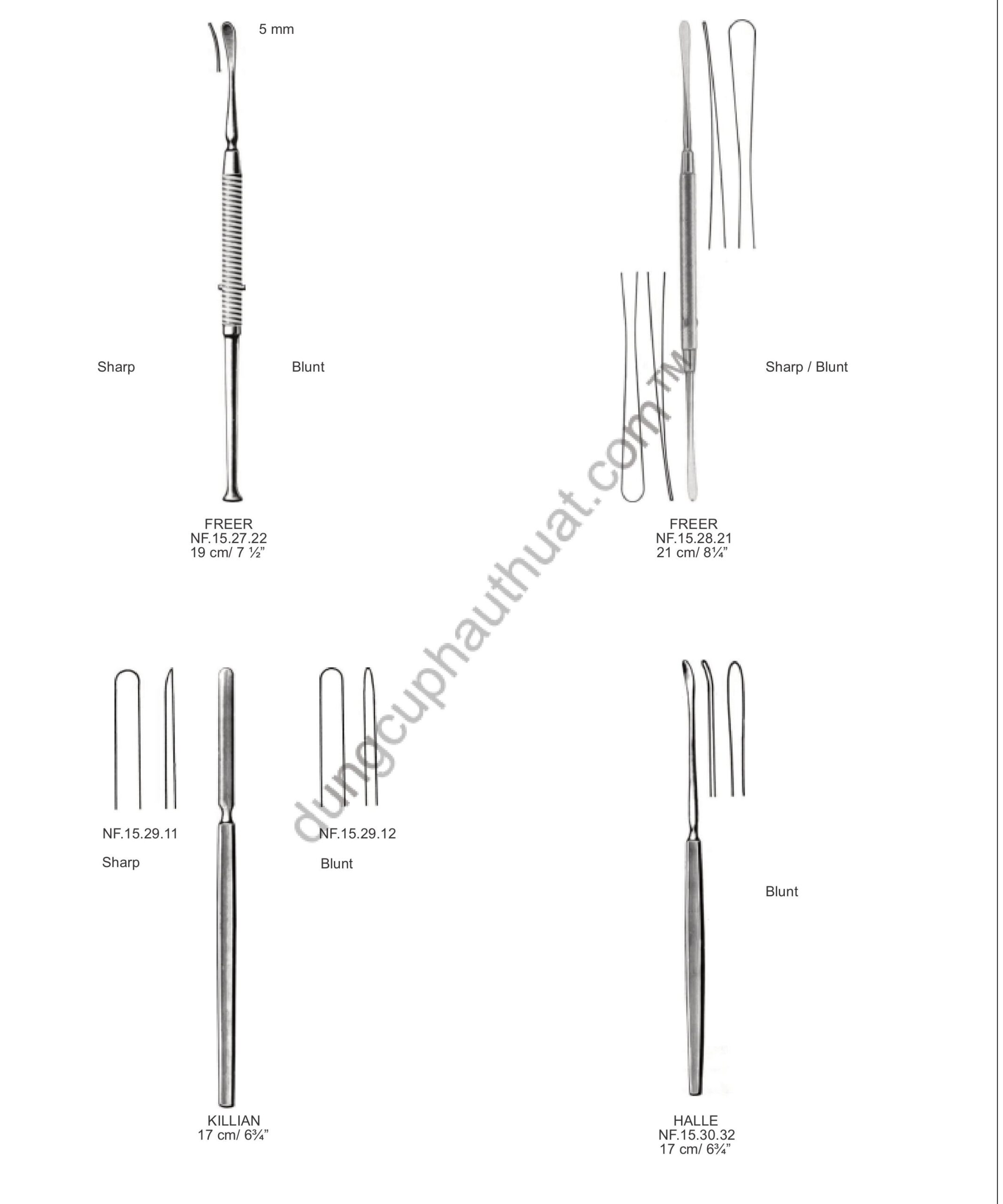 Dụng cụ bóc tách Freer (Freer Elevator): Dụng cụ hai đầu dẹt, dùng để tách lớp niêm mạc mỏng manh ra khỏi sụn vách ngăn mà không làm rách nó.