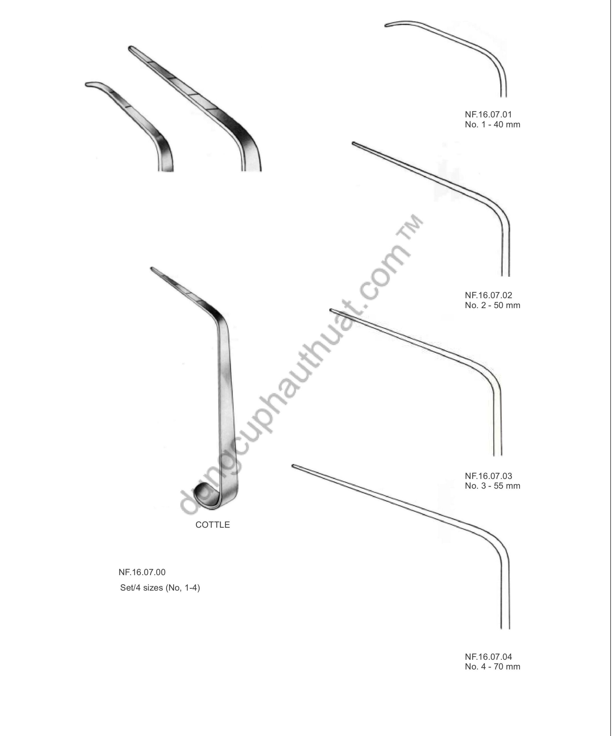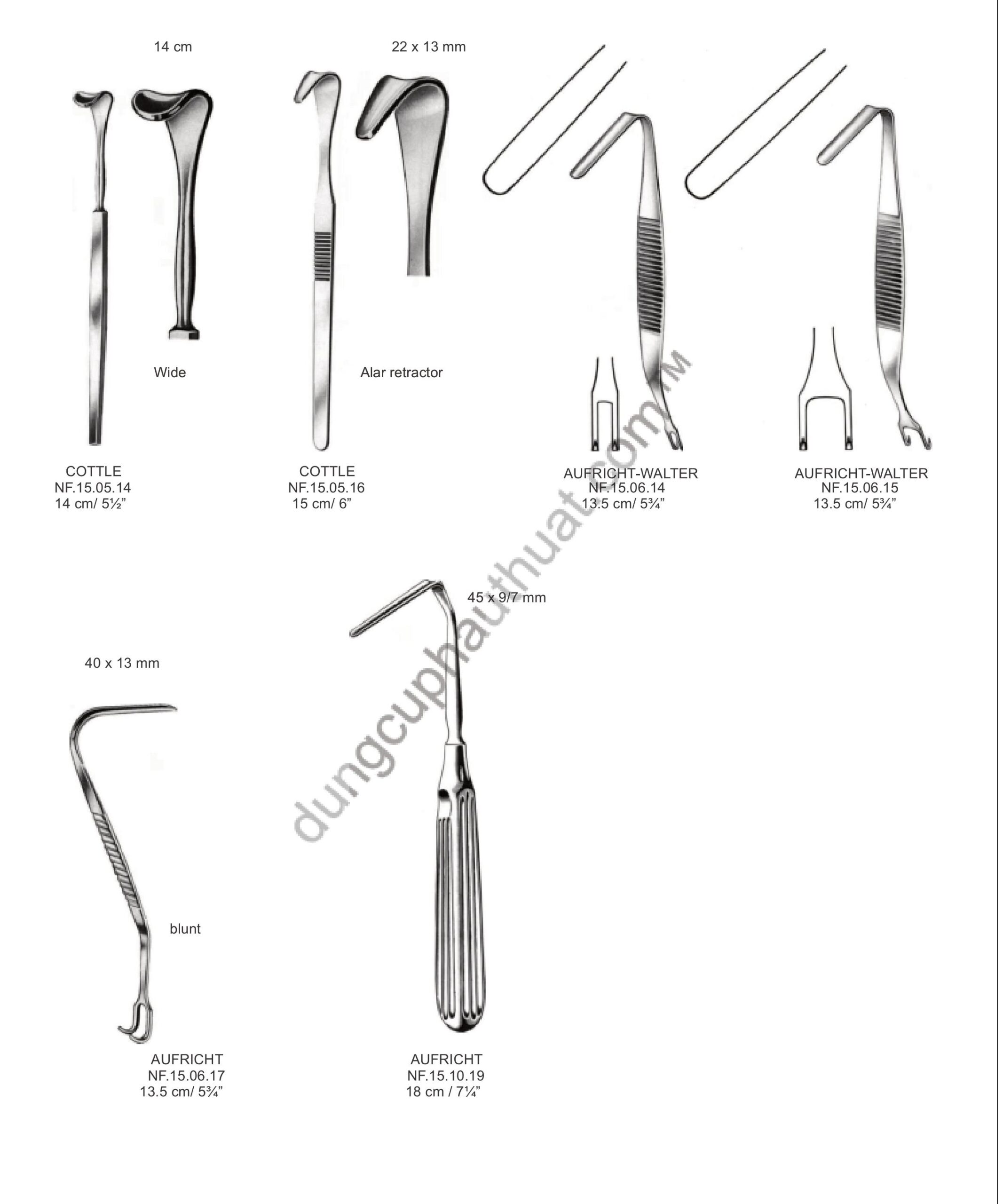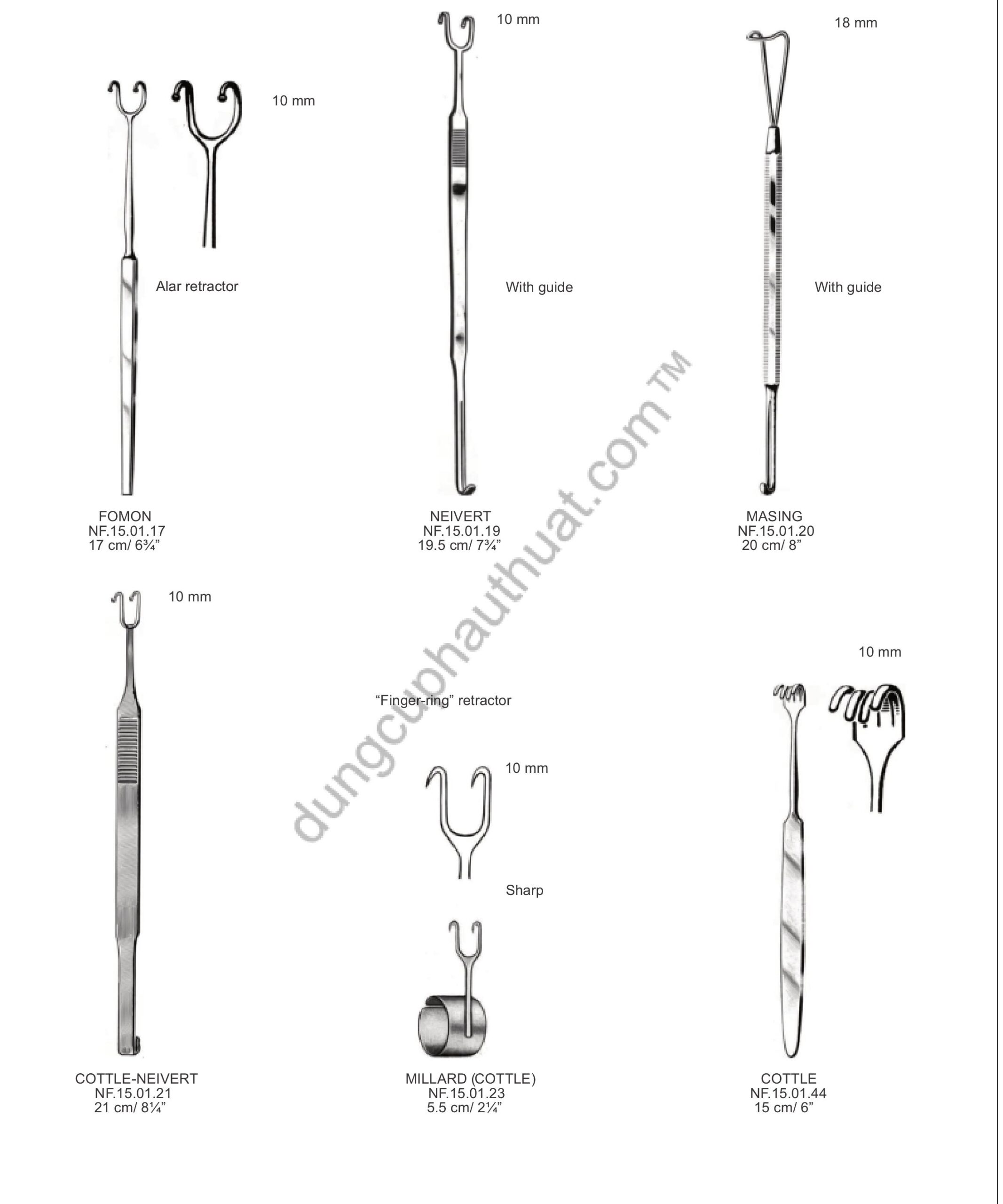Dụng Cụ Fomon / Cottle / Kilner / Converse: Dạng móc (hook) đơn hoặc đôi, dùng để kéo cánh mũi trong phẫu thuật tạo hình.